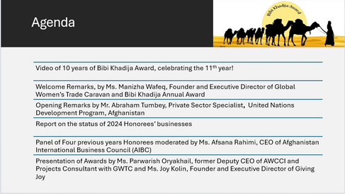 The 11th Annual Bibi Khadija Award was convened virtually on December 22, 2025, continuing a decade-long tradition of recognizing and supporting Afghan women entrepreneurs and economic actors. Named after Khadija, the wife of the Prophet Mohammad (PBUH), a successful businesswoman who led trade caravans over 1400 years ago. The award highlights women’s economic leadership rooted in history, resilience, and enterprise.